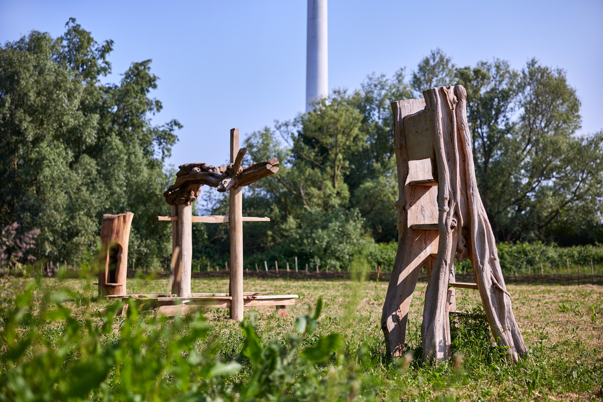 Floris Brasser brings together three of his extraordinary wooden works for Ruigoord – Oase van Verwondering: an imposing, split tree (that you can enter and even climb on), a staircase with a high seat and an interactive gate. They are tree sculptures to touch, climb, step into, sit on and play with.