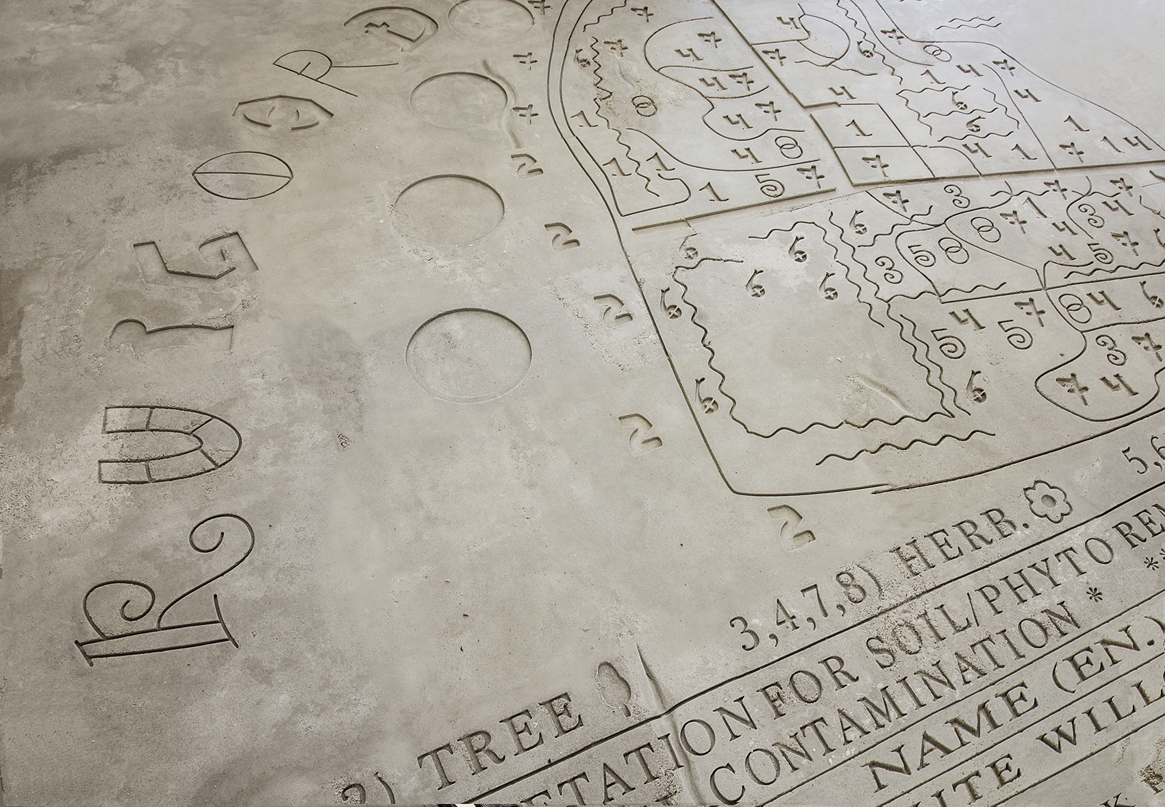 The installation, Ruigoord; native vegetation for phytoremediation, by visual artist Lennart Lahuis consists of a sand drawing that has been magically embedded in the soil of Ruigoord. The drawing shows a map of Ruigoord filled with a web of numbers. These numbers indicate the locations of plants and trees found in Ruigoord that are capable of counteracting soil pollution by naturally breaking it down. Below the map, a chart can be seen that describes these plants and trees. The drawing lies submerged under water, appearing and disappearing with the play of wind on the surface and the reflection of sunlight, the work can rarely be taken in at a single glance.